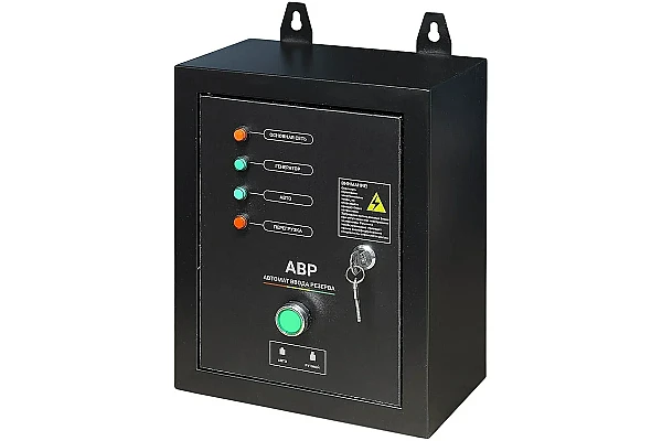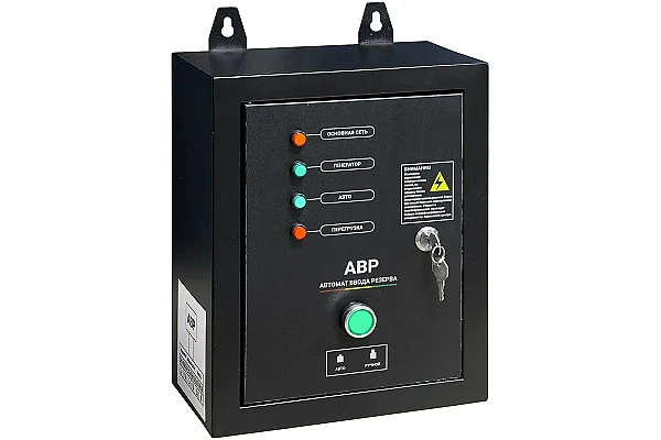 Блок АВР-С TSS 9000D/230/400 представляет собой выносное устройство управления, предназначенное для реализации функций автоматического ввода резерва. В случае перебоев в электроснабжении оно задействует цепи активации автономного источника энергии и переключает на него питание потребителей после выхода на рабочий режим. При восстановлении нормальной работы централизованной электросети автоматика выполняет обратное переключение нагрузок и останавливает резервный генератор TSS.