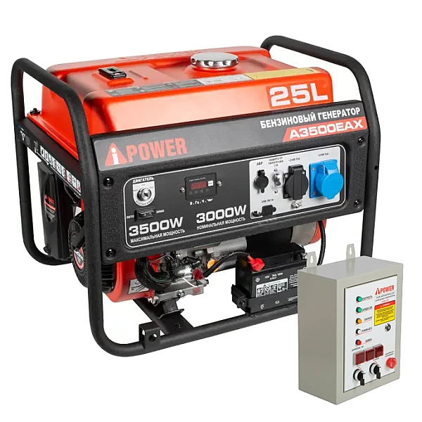 Бензиновый генератор A-iPower A3500EAX + блок автозапуска A-iPower 400 В, 25 А - надежный источник питания мощностью 3 кВт. Главные преимущества модели - до 14 часов работы на одном баке топлива и возможность подключения приборов с пусковой мощностью до 7 кВA, например, высоко производительного ручного инструмента с электродвигателем.
