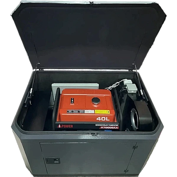 Бензиновый генератор A-iPower A7000EAX в супертихом зимнем кожухе 1400SS RAL 7024 - надежный источник питания мощностью 6.5 кВт. Главные преимущества модели - до 12 часов работы на одном баке топлива и возможность подключения высоко индуктивных приборов с пусковой мощностью до 14 кВA.