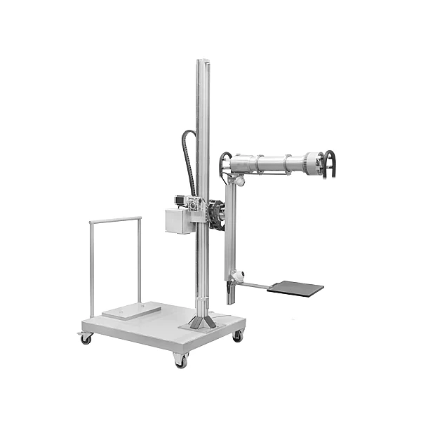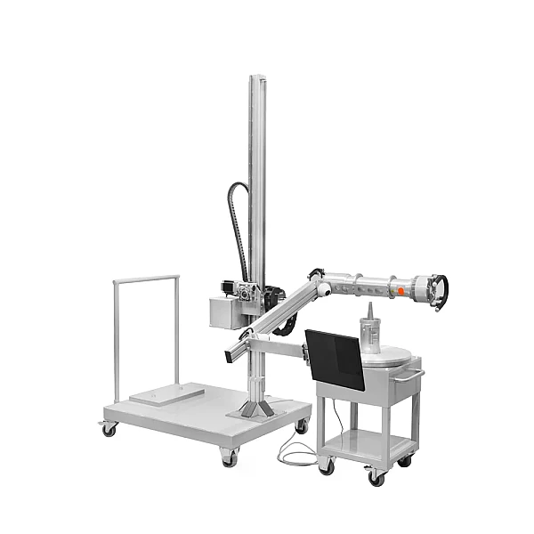 Манипулятор позволяет расположить рентгеновский аппарат и детектор в любой плоскости относительно объекта контроля на необходимой высоте в диапазоне вертикального хода стрелы (ось Y) и наклона манипулятора (ось U). Дополнительно манипулятор имеет возможность ручного изменения фокусного расстояния за счет перемещения штанги крепления детектора на основании П-образного манипулятора. Защитные кабельные цепи манипулятора исключают обрывы, перегибы и излишнее натяжение кабельных трасс во всем диапазоне перемещений. Перемещение по осям манипулятора осуществляется с помощью шаговых мотор-редукторов.