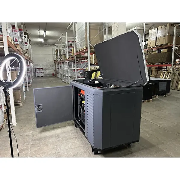 Кожух для генератора предоставляет легкий доступ к оборудованию со всех сторон, для этого предусмотрены два боковых люка и верхняя крышка, которая крепится петлями промышленного класса и удерживается в нужном положении газовыми амортизаторами. Обе дверцы и крышка защищены замками.
