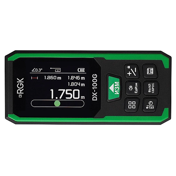 Лазерный дальномер RGK DX-100G – профессиональный измерительный инструмент строительного назначения, предназначенный для использования на дистанциях до 100 м, с помощью которого можно выполнять обмеры участков, строений и прочих объектов. Прибор оборудован зеленым излучателем, упрощающим выполнение работ на ярком солнце – за счет хорошей различимости маркера, используемого для визуального наведения, а встроенный инклинометр позволяет контролировать величину вертикальных углов и производить выравнивание. К преимуществам изделия относится наличие цветного графического дисплея, обеспечивающего высокую наглядность и информативность, а также аккумуляторного питания с подзарядкой через USB Type-C, за счет чего инструмент отличается экономичностью, не нуждаясь в замене батареек.