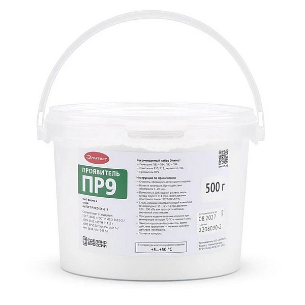Проявитель Элитест ПР9 используется при проведении люминесцентного капиллярного контроля. Представляет собой сыпучий белый порошок, наносится посыпанием, воздушной взвесью в шторм-камере или электростатическим напылением. Равномерно ложится на поверхность и хорошо вытягивает находящийся в полости дефекта пенетрант. Белый фон, создаваемый проявителем, повышает четкость индикаторного рисунка.