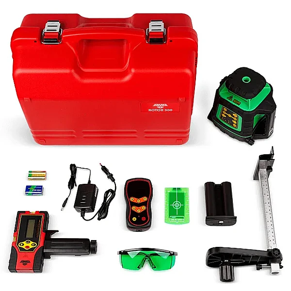 Ротационный лазерный нивелир AMO ROTOR 300G проецирует вертикальную и горизонтальную плоскости с разверткой на 360°. Прибор позволяет с высокой точностью проводить выравнивание дорожного полотна, выполнять разметку во время таких строительных работ, как заливка полов, возведение стен и фундаментов. Дальность работы составляет 600 м. Нивелир имеет яркий лазер зеленого цвета, который отлично видно при работе как внутри, так и снаружи помещения. Лазерный уровень работает от четырех щелочных батареек или перезаряжаемого аккумулятора.